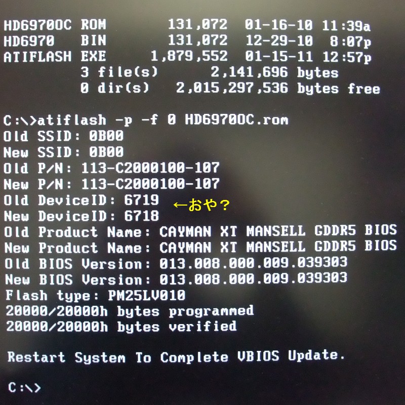 起動後にATIflashのあるディレクトリに移り、コマンドで「atiflash -p -f 0 (ROMファイル名)」と入れてEnterを押せば書き換えが行われます。