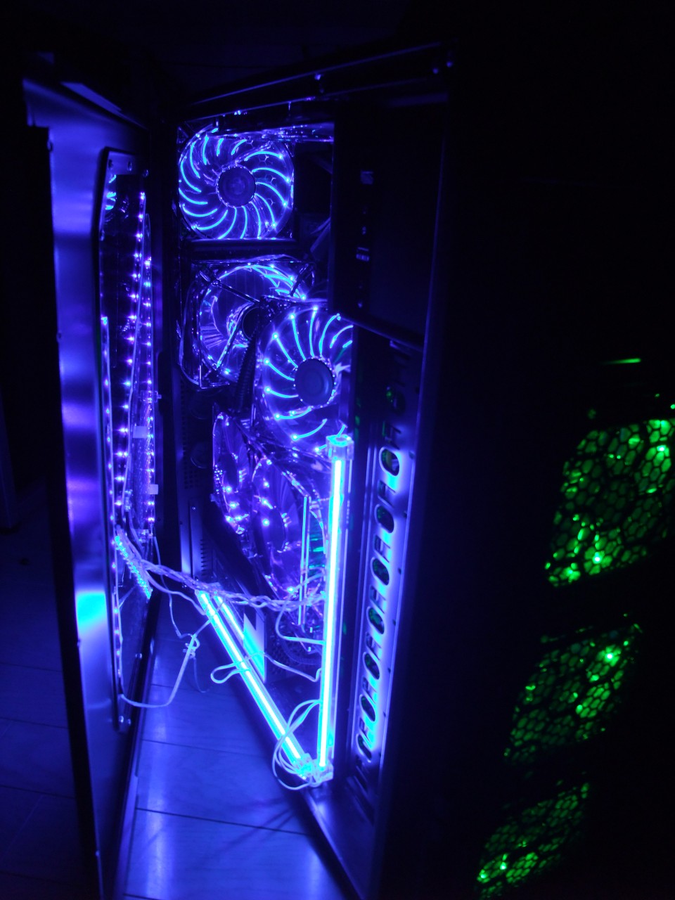 他にもLED装飾具や蛍光管なども入れて、夜は部屋の明かりを消しても問題なく生活できる程光ります。直視すると目がやられるほど…